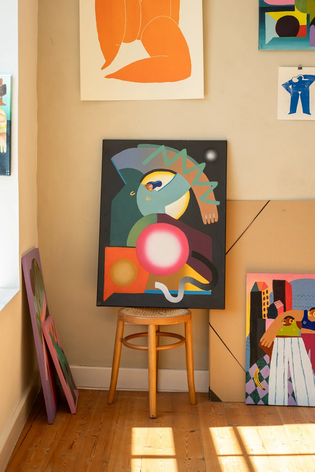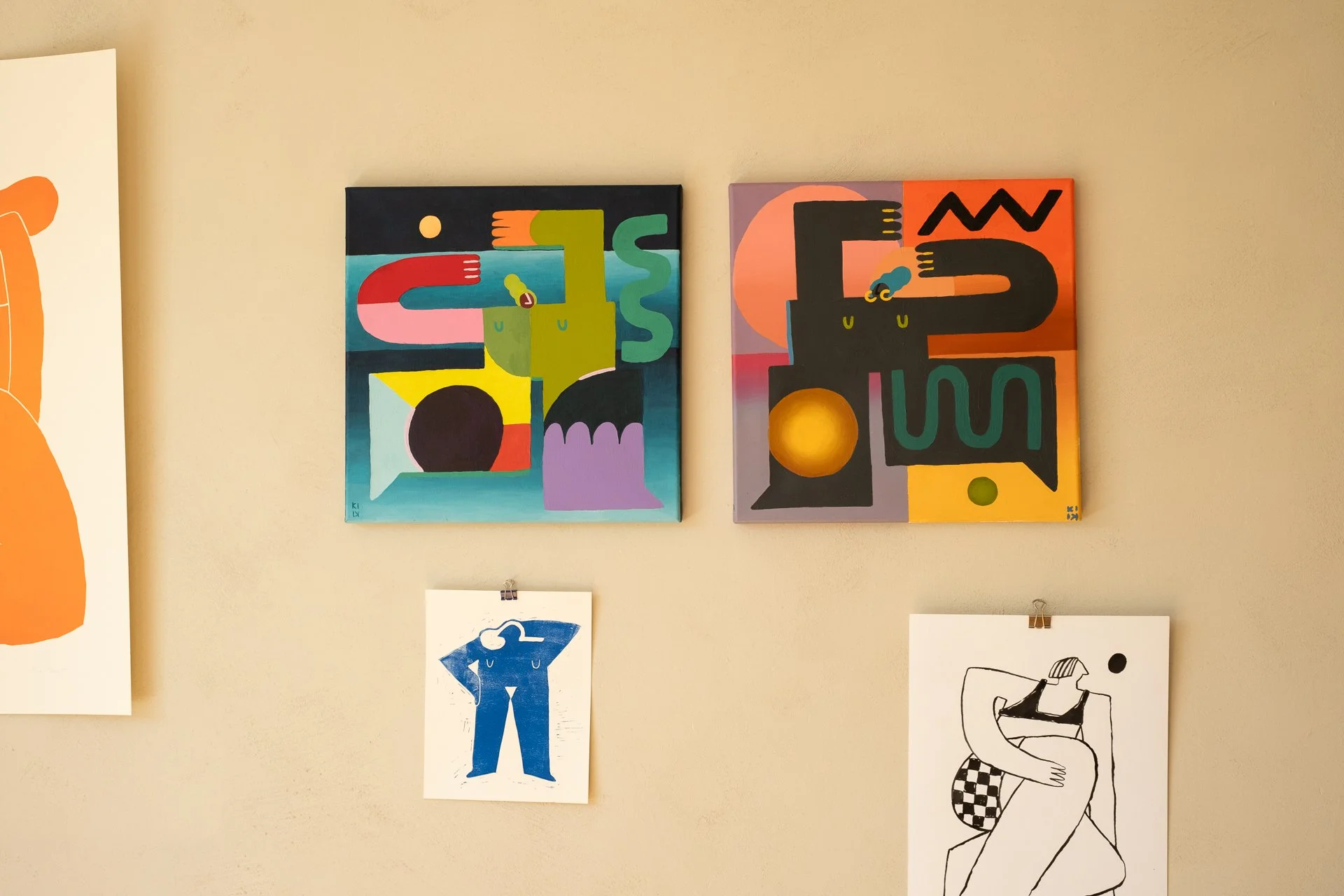 Inspiration zieht Kiki Peter aus der Urbanität und Vielfalt Berlins, der Natur und ihren Freundinnenschaften. Daraus entstehen farbenfrohe und fantasievolle Kompositionen in Acrylfarbe auf Leinwand.